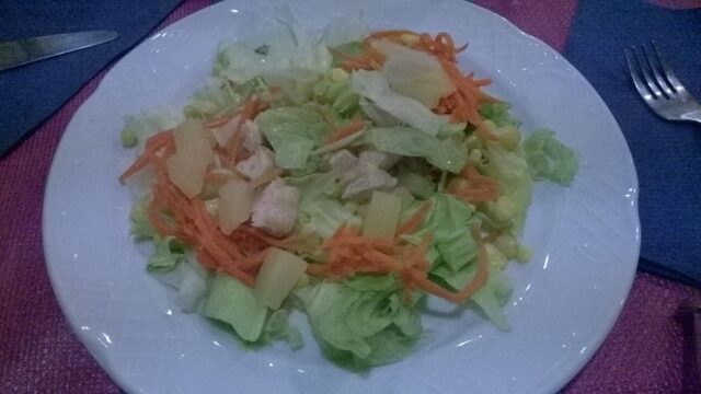 Lavate accuratamente la lattuga e lasciatela colare. Da parte tagliate l’aglio finemente, l’ananas, il parmigiano e il pane a cubetti. Mettete in forno i cubetti di pane e fateli abbrustolire, poi lasciateli raffreddare. Cuocete a bagnomaria l’uovo, fino a farlo diventare sodo. Pulitelo e cuocete in padella con olio, sale, pepe e aglio il petto di pollo. Tagliatelo a filetti e disponetelo sulle fettine di lattuga. Aggiungete il parmigiano, l’ananas, l’uovo il parmigiano e infine la salsa Worchster.