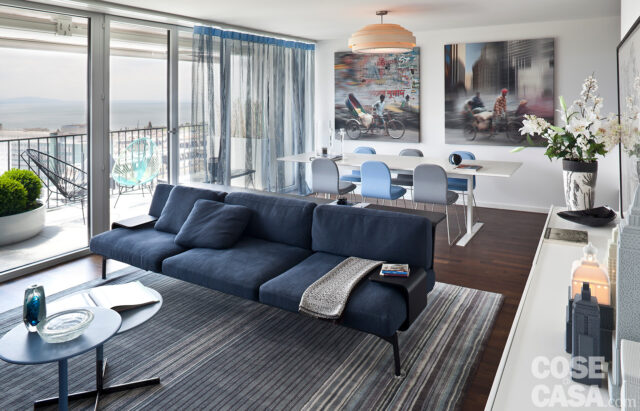 In ogni ambiente della casa è scelta dei colori e delle finiture che concorre più di tutto – in misura persino maggiore del materiale scelto – al risultato finale, all’effetto d’insieme: le tonalità di elementi tessili, arredi e anche di pavimenti e pareti sono la vera anima degli ambienti e contribuiscono a creare la prima impressione di una stanza. Il soggiorno nella foto sotto è arredato sui toni del blu, dell’azzurro e dei grigi; il pavimento è in legno scuro. Il risultato è una rilassante eleganza. Divano, tappeti, tendaggi, sedie, anche il piano in pelle dei tavolini: nelle finiture e nei tessuti queste tonalità, utilizzate in gradazione per i diversi elementi, hanno soprattutto l’obiettivo di richiamare ed enfatizzare i colori naturali dell’esterno dell’appartamento, che affaccia su una terrazza panoramica. L’azzurro del cielo si armonizza quindi con l’ambiente indoor. I toni dell’azzurro e del blu sono i colori del relax e della quiete: risaltano e vengono valorizzati dal contrasto con uno sfondo scuro (in questo caso il pavimento in wengé) o bianco.