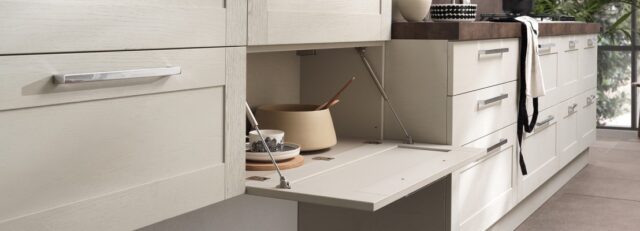 Nelle nuove cucine anche i “contenitori” sono interpretati in modo innovativo attraverso dettagli e finiture che abbinano solidità e funzionalità, in nuances di colori che si accordano a quelli della composizione a vista. Nei moduli dispensa, ad anta o a cassetti di varie dimensioni, l’interno è razionalizzato con precisione per dare spazio a ogni cosa e agevolare i lavori domestici di preparazione e pulizia. Le nuove proposte, migliorate grazie alla tecnologia e all’innovazione dei materiali, consentono di superare la sequenza uniforme dei moduli per comporsi come un vero e proprio “puzzle”; si integrano così gli spazi di movimento e le zone operative, con un design immediato che consente di dar vita a un proprio personalizzato ambiente domestico. Particolarmente pratiche le ante a ribalta nei moduli larghi e “bassi”, così come i cestelli scorrevoli nelle alte colonne dispensa, che permettono di sfruttare al meglio la profondità del vano con la massima comodità di vedere alla luce il contenuto e prendere senza difficoltà ciò che serve.