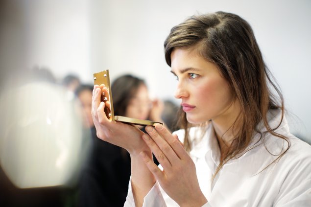 Una studiata composizione e miscela del colore e della materia di cui è artefice il key make up artist della sfilata Dick Page. Per ottenere un incarnato luminoso come quello della modella Julia Van Os nelle foto, ha mischiato insieme sul suo polso le due formule di Paintstick Basic Red e Deep Brown di Mac Cosmetics e poi le ha applicate con un pennello sulla pelle per dare un velo di colore traslucente, come un fard ma molto più naturale. Poi ha scaldato gli zigomi unendo insieme le tre tonalità (Flush, Beam e Glow) della polvere Bronze Powder. Gli occhi sono stati definiti da un tratto di eyeliner, le ciglia colorate con un mascara marrone, le labbra sono state dipinte con due rossetti di diverso colore della collezione make up di Michael Kors: Lip Lacquer Diva (tinta cabernet profondo con bacche scure) e Dama (pesca).