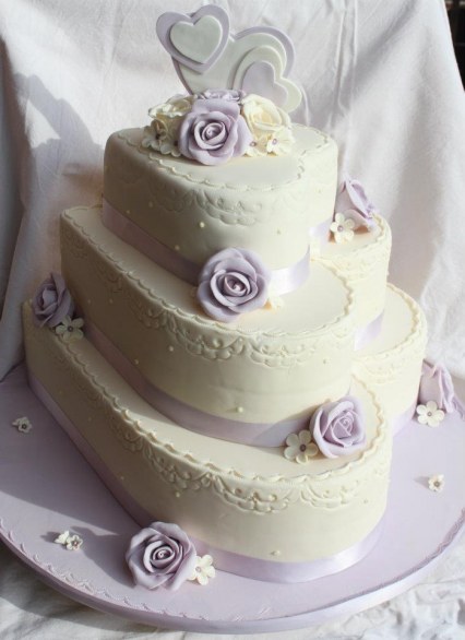 2. Ispiratevi all’abito nuziale. La torta può essere ispirata anche all’abito della sposa: bianca o crema, decorata con nastri, perle, fiori e strass, questo tipo di torta è particolarmente di impatto. Molto di moda le decorazioni che riproducono il pizzo, ma anche i pois.